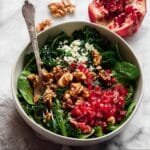 A vibrant and festive pomegranate salad featuring marinated kale and baby spinach, topped with crunchy honey cinnamon walnuts, creamy blue cheese, and juicy pomegranate arils. The salad is dressed with a tangy pomegranate molasses dressing that perfectly balances the flavors. Ideal as a refreshing side dish or a filling lunch, it keeps well when dressed and offers a delightful combination of textures and tastes.